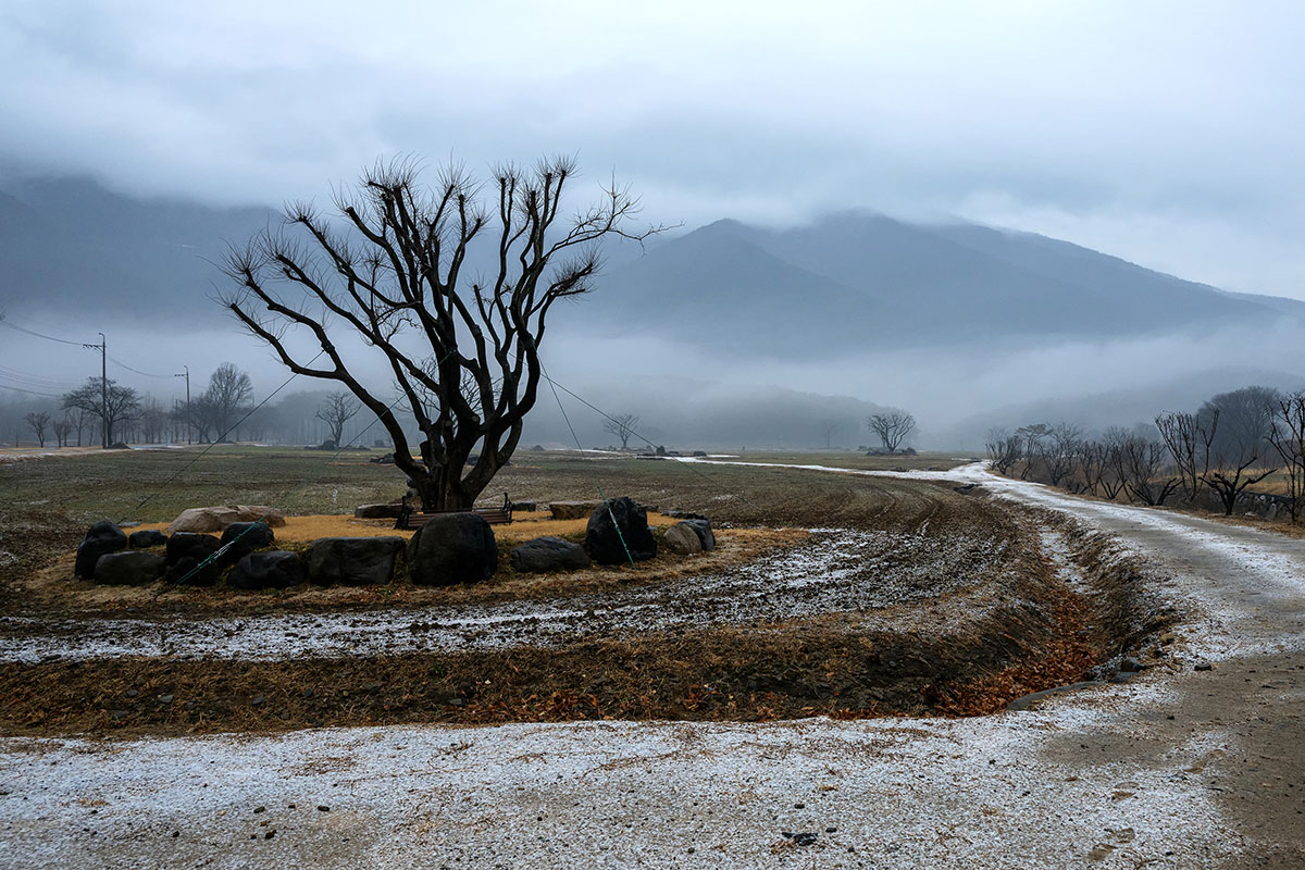 눈이 귀한 부산에 함박눈이 내리던 날이었다. 달뜬 마음에 냅다 통도사로 향했는데 그사이 눈은 그쳐 버렸다. 다행히 내린 눈이 녹으면서 하얀 안개를 피워 영축산을 덮고 산허리를 감고 흘렀다. 시나브로 변하는 안개는 고요를 느끼게 하고 세상이 멈춘 듯한 풍경을 선사했다. 안개는 나의 시선을 가렸으나 그 속에 감춰놓은 것에 대하여 무한 상상을 자극했다. 안개 저 너머에서 다가오는 무언의 희망을 이 겨울에 느끼게 하는 풍경이었다. 찬란한 희망의 봄이 오는 소리와 다름없는.